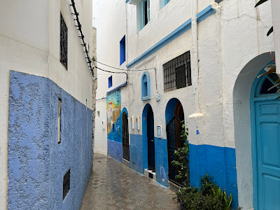 I was last in Tangier on a bright sunny day in 2017. Today, however, is the first bad weather day since we left Tucson on 26 March. The rain and wind will be with us on and off all day. Will decides to remain on Quest rather than risk slipping and sliding on the slick cobblestone and hilly streets. I continue on no matter the weather. I had signed up for another long (8-hour) shore excursion to the "blue city" of Chefchaouen, about a 2.5 hour bus ride southeast of Tangier. But that shore excursion was cancelled since not enough passengers had signed up. Instead, I am on a 6-hour tour--"The Very Best of Tangier, Kasbah & Azilah"--which turns out to be a good choice.